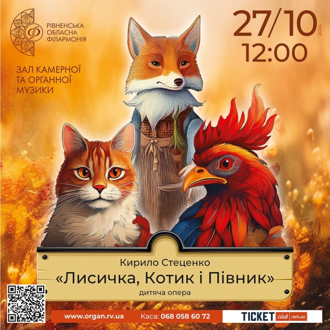 27 жовтня на 12:00 покажуть виставу “Лисичка, котик та півник”. Це дитяча опера про пригоди півника, якого щоразу обдурює і викрадає хитра лисичка та про його відважного побратима – котика, який неодноразово успішно рятує свого друга.