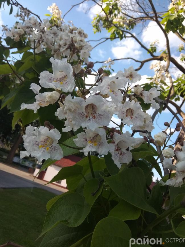 Це високе дерево з великими біло-рожевими квітами навесні тішить ніжними суцвіттями поміж зеленого лапатого листя, а восени – великими стручками дивовижної форми, повідомляє Оstrog.rayon.