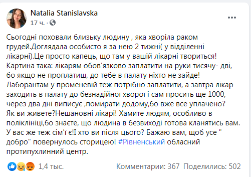 – Що стосується поборів, то ми зацікавлені в такій інформації. Якщо керівники закладів порушують всі етичні норми і щось вимагають, будь ласка, інформуйте на гарячу лінію. Єдине, що буває таке, що пацієнти чи його родичі хочуть кращі ліки, ніж ті, які надаються безкоштовно. Тоді вони купують дійсно за власний рахунок.