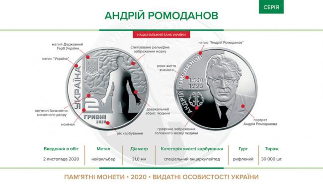 Монета присвячена видатному вченому, громадському діячу, педагогу, засновнику нейрохірургічної школи в Україні, доктору медичних наук, професору, академіку Національної академії наук України Андрію Петровичу Ромоданову, повідомила пресслужба НБУ.