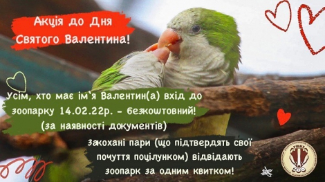Цікаву акцію до прийдешнього дня святого Валентина пропонує рівненський зоопарк. Кожному, хто зможе довести, що його дійсно звати Валентином або Валентиною (не забувайте пред’явити документи), платити за вхід на територію 14 лютого не доведеться. Також закохані парочки можуть зекономити, якщо поцілуються перед касою – пройдуть за одним квитком замість двох.