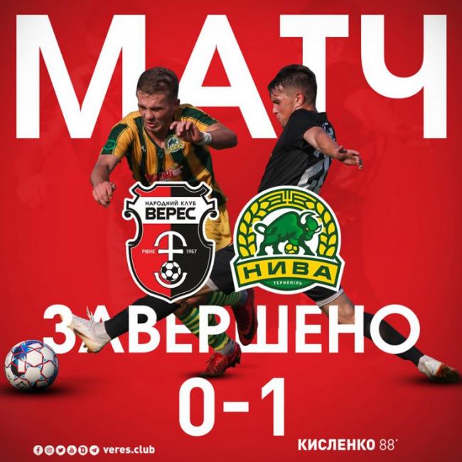 Навіть у чисельній меншості “Верес” більше атакував. Але “Ниві” знову допомогла Фортуна. Після удару Сергія Кисленка м’яч влучив у ногу Сергія Петька, змінив траекторію руху і влетів у сітку воріт Ігоря Фіяла – 0:1. “Нива” одноосібно очолила турнірну таблицю ліги, а “Верес” зазнав першої поразки у чемпіонаті.