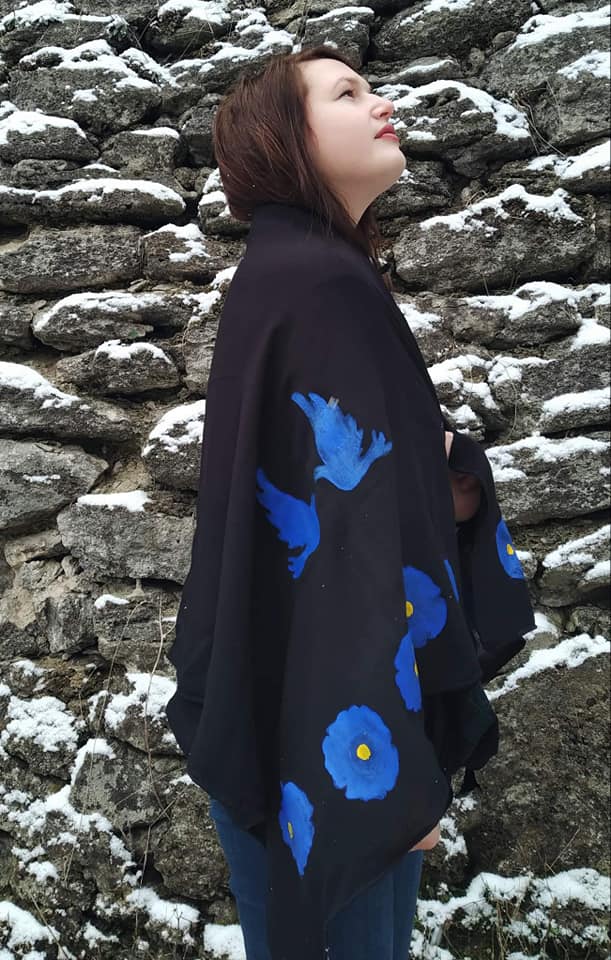 – Тканина сохне 1- 2 тижні. Все залежить від кількості фарби. – У Вас є команда помічників? – Над виробами працюю самостійно. Але мені морально допомагає велика кількість людей. Серед тих, хто надихає є мій коханий чоловік, посестри, побратими та люди, які просто повірили в мене і мою ціль.
