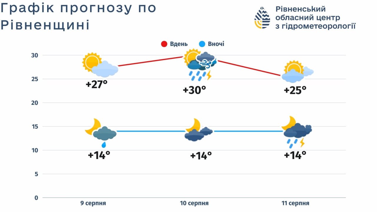 – Мінлива хмарність. Вночі та вранці місцями невеликий короткочасний дощ, гроза. Вдень без опадів. Вночі та вранці місцями слабкий туман. Вітер західний, 7-12 м/с. Температура вночі +11..+16º, вдень +22..+27º. Атмосферний тиск суттєво не зміниться.