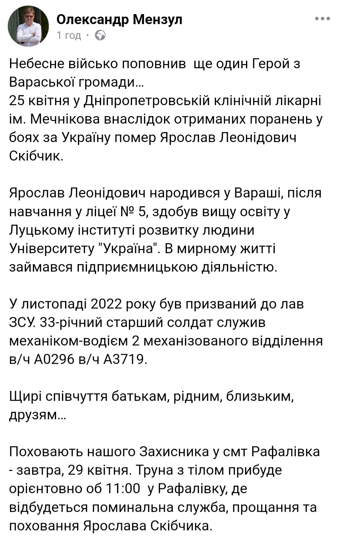 Новини Від важких поранень у лікарні помер захисник з Вараша Лікарі намагалися врятувати йому життя... admin 28 Квітня 2024, 17:40 0 хв. читання Поділитися Сьогодні про смерть воїна повідомив міський голова Вараша. За 47 мільйонів продають дозвіл на видобуток бурштину на Поліссі Графік відключення електроенергії на Рівненщині 24 грудня Панічна атака: «Це ніби хтось раптом перекрив тобі кисень» Рівнянин уник покарання за те, що побив солдата на залізничному вокзалі Коваль привіз вікна до будинку, де після атаки Росії повилітало скло Поділитися цією статтею Facebook Telegram Копіювати посилання Приєднуйтесь 58KСтежити1.2KСтежити13.9KСтежити6.1KПідписатися Читайте нас у Telegram: тільки важливі та перевірені новини Новини 23 Грудня 2025 За 47 мільйонів продають дозвіл на видобуток бурштину на Поліссі 21:30 Графік відключення електроенергії на Рівненщині 24 грудня 20:49 Панічна атака: «Це ніби хтось раптом перекрив тобі кисень» 20:46 Рівнянин уник покарання за те, що побив солдата на залізничному вокзалі 20:23 📷Коваль привіз вікна до будинку, де після атаки Росії повилітало скло 19:45 Яка техніка допоможе з прибиранням приміщень на підприємстві 18:25 Рівне частково залишилося без тепла 17:55 – Рівне уникло колапсу під час відключення світла, – Шакирзян 17:50 Сержант з Рівного загинув у бою на Донеччині 16:44 У Рівному помітили ультра-рідкісний електромобіль за пів мільйона доларів 16:25 Всі новини