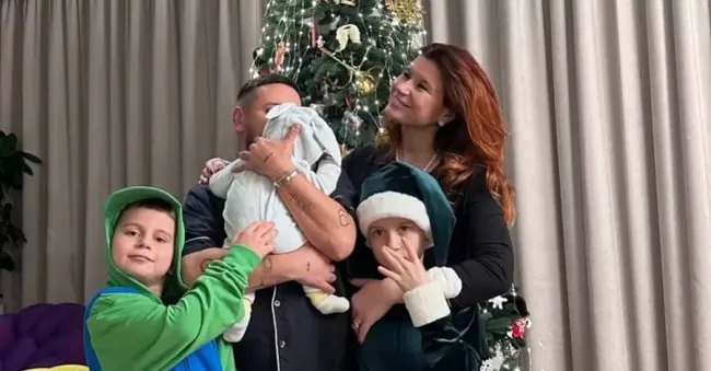 Багатодітний батько опублікував світлину у Святвечір напередодні Різдва Христового. На ній він позує біля ялинки з дружиною та трьома дітьми. Артист тримає на руках новонародженого малюка, який одягнений у блакитний костюм. Ім’я дитини подружжя поки що не розкриває.