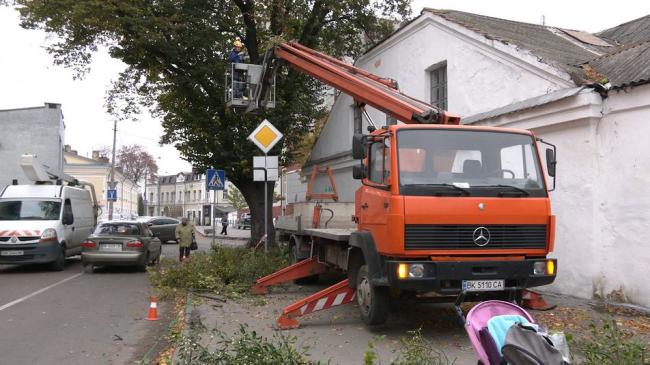Виявляється, що міські комунальники до цієї справи відношення не мають. Це громадські активісти, які опікуються озелененням міста, разом із спеціалістом ще торік оглянули вікові дерева у Рівному, і тільки зараз з’явилась фінансова можливість їх очистити і полікувати. У Рівному — приблизно 75 дерев поважного віку, серед них — і липа на Драгоманова, якій понад сотня років.