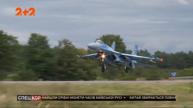 Пілот Су-27, сідаючи під час навчань на трасі Київ-Чоп на Рівненшині, зачепив знак повітряним забірником . А далі разом з вказівником, який інформував про рекомендовану швидкість, здійнявся у небо.