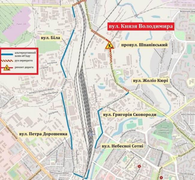 У зв’язку з перекриттям вулиці, просимо скористатись шляхами об’їзду через вулиці: Біла – П. Дорошенка – Пересопницька – Небесної Сотні – Г. Сковороди. Для того, щоб потрапити на ділянку вулиці від буд.111 вул. Кн. Володимира можна буде доїхати з боку вул. Біла, до буд. 109 Князя Володимира з боку вул. Г. Сковороди.
