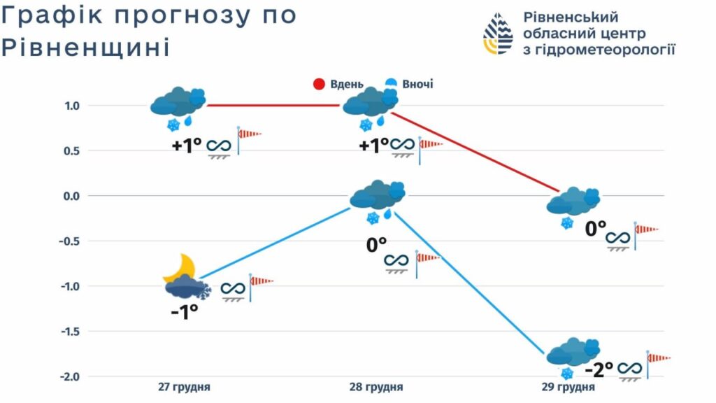 Сьогодні, 27 грудня: хмарно. Вранці та вдень невеликий сніг та дощ. Вранці та вдень слабка ожеледь, слабке налипання мокрого снігу. На дорогах ожеледиця Вітер північно-західний, 9-14 м/с,  пориви 15-20 м/с! Температура вдень -2°..+3°.