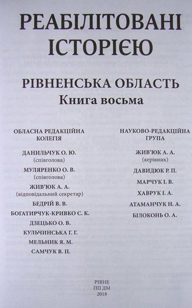 – Отримали восьму книгу “Реабілітовані історією. Рівненська область”. Традиційно дякуємо тим, хто причетний до її видання — обласній раді, обласній державній адміністрації, державному архіву, управлінню служби безпеки, головному управлінню поліції, головній редколегії в Києві, членам науково-редакційної групи, авторам статей, видавцям, усім, хто допоміг. Пам’ятаймо про тих, хто поліг і хто пережив, — повідомив керівник науково-редакційної групи серії історик Андрій Жив’юк на своїй сторінці у “Фейсбуці”.