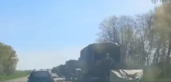 Як повідомляє Telegram-канал «Беларускі Гаюн», прямо зараз велика колона військової техніки рухається в напрямку Пінська. Пінський район межує з Рівненською та Волинською областями.