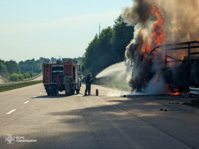 Рятувальники, що прибули на місце, одразу взялися гасити палаючу фуру.