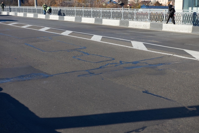 – Під дією різких стрибків температури та транспортних навантажень асфальт деформувався. Для того, щоб попередити утворення ямковості, була проведена заливка тріщин та швів мастикою.
