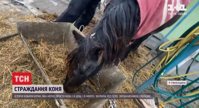 На подвір’ї вкрита ковдрою, щоб хоч трохи було тепліше, цілодобово стоїть кобила Муха. Історія про коня, що замерзає підняла на вуха місцевих користувачів соцмереж. ЇЇ власник каже, що не може домовитися з дружиною. Мовляв, зараз розлучається з жінкою і вона аби насолити йому, спеціально заселила хлів поросятами. Те що для Мухи місця нема.