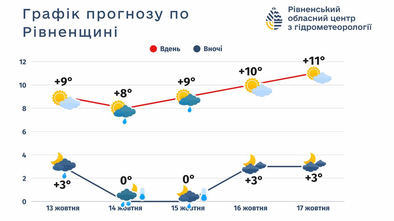 14 жовтня, вівторок: хмарно з проясненнями Вночі місцями невеликий дощ з мокрим снігом, вдень невеликий дощ. Вночі та вранці слабкий туман. Вітер північно-західний, 7-12 м/с. Температура вночі заморозки 0-2°! вдень 6-11° тепла. Атмосферний тиск буде слабо рости.