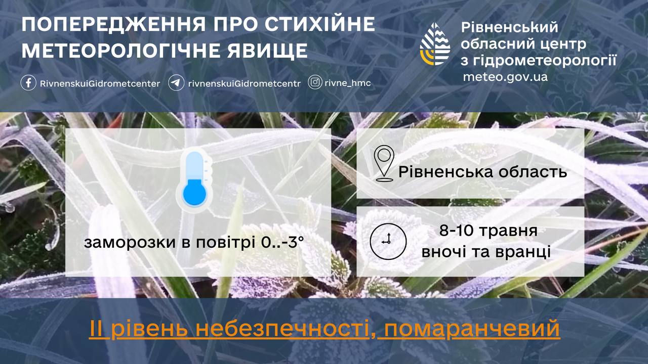 Новини Вночі на Рівненщині – сильні заморозки Вночі та вранці 8-10 травня очікуються заморозки в повітрі 0..-3º!, ІІ рівень небезпечності - помаранчевий. Заморозки в повітрі можуть спричинити пошкодження плодових дерев, овочевих та ягідних культур, - попереджають рівненські синоптики. admin 7 Травня 2025, 17:00 0 хв. читання Поділитися За прогнозом обласного центру з гідрометеорології завтра нас очікує мінлива хмарність: – Без опадів. Вітер північний, 5-10 м/с. По області вночі сильні заморозки 0-3°; вдень +9.+14°; у Рівному вночі заморозки 0-2°; вдень +10..+12°. Півтора мільйона застави визначив суд для доньки керівниці з Рівного Головного лікаря діагностичного виправдали у справі про п’яне водіння Якісні товари з Італії для дому: на які бренди варто звернути особливу увагу Як вибрати хостинг для сайту в Україні: поради від практиків У Рівному колядують медики Поділитися цією статтею Facebook Telegram Копіювати посилання Приєднуйтесь 58KСтежити1.2KСтежити13.9KСтежити6.1KПідписатися Читайте нас у Telegram: тільки важливі та перевірені новини Новини 29 Грудня 2025 Півтора мільйона застави визначив суд для доньки керівниці з Рівного 22:42 Головного лікаря діагностичного виправдали у справі про п’яне водіння 22:25 Якісні товари з Італії для дому: на які бренди варто звернути особливу увагу 22:20 Як вибрати хостинг для сайту в Україні: поради від практиків 21:35 📷У Рівному колядують медики 21:20 📷Костопільчанка вилетіла з відомого кулінарного шоу за крок до суперфіналу 20:14 Ялинка, цукерки і мінометний вогонь: як бійці ССО зустрічають Новий рік на фронті 19:12 У Рівному з різдвяним концертом виступить Національний хор Верьовки 18:30 Від фенів – до навушників: ділки масово підробляли популярну техніку та збували по всій Україні 17:30 Вулицями Рівного бігала лисиця 17:01 Всі новини