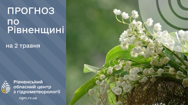 – Мінлива хмарність. Без опадів. Вітер південний, південно-західний, 5-10 м/с. Температура по області: вночі +1..+6º; на поверхні грунту заморозки 0-3º, вдень +16..+21º; у Рівному вночі +2..+4º; на поверхні грунту заморозки 0-2º, вдень +18..+20º.