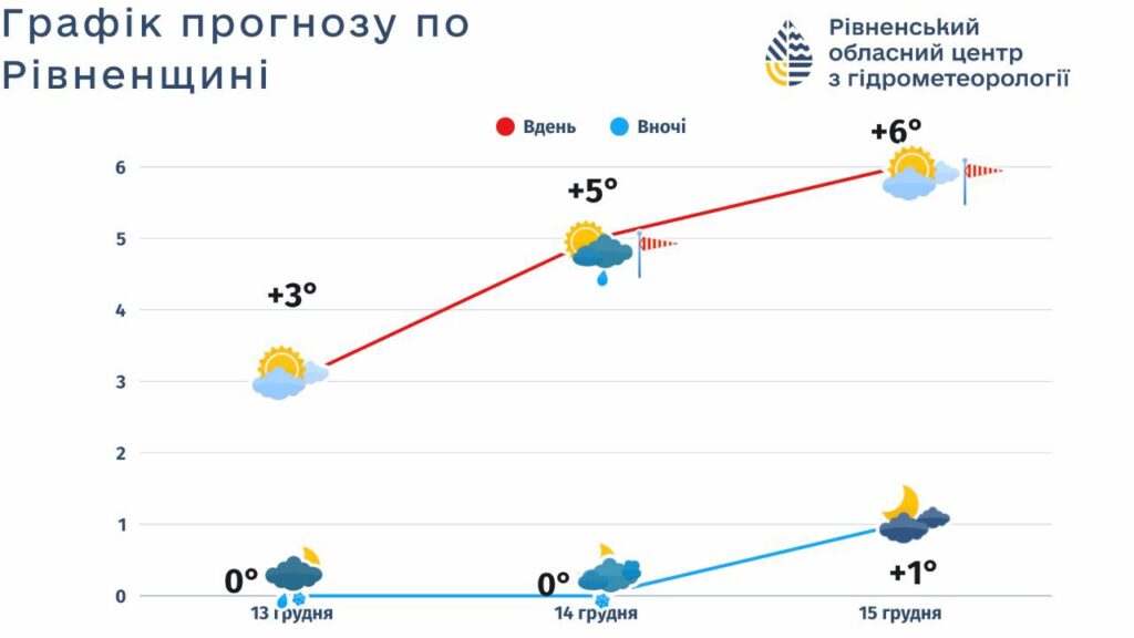 13 грудня, субота: хмарно з проясненнями. Вночі невеликий дощ, місцями з мокрим снігом. Вдень без опадів. Вітер північно-східний, 5-10 м/с. Температура вночі -2°..+3°, вдень 0..+5°. Атмосферний тиск вночі буде рости, а вдень почне падати.