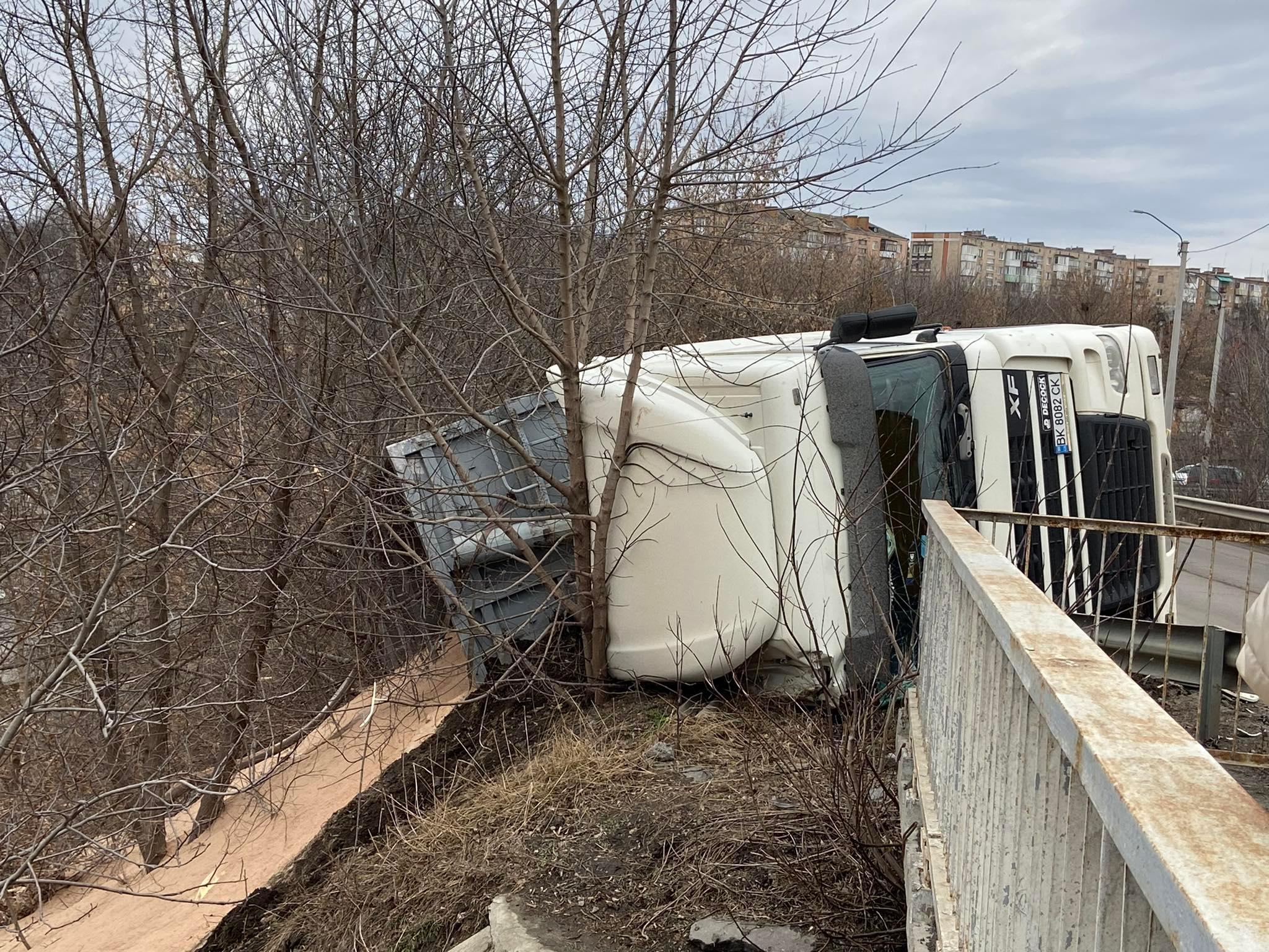 За словами водія, причиною цієї ДТП – стала яма на дорозі, в яку він випадково влетів. Чоловік був пристебнутий паском безпеки, отож ушкоджень не отримав. Вантажівка пошкодила лише відбійник, а на вулиці Князя Володимира миттю утворились затори. З кузова автомобіля, який впав на бік, посипалися висівки.