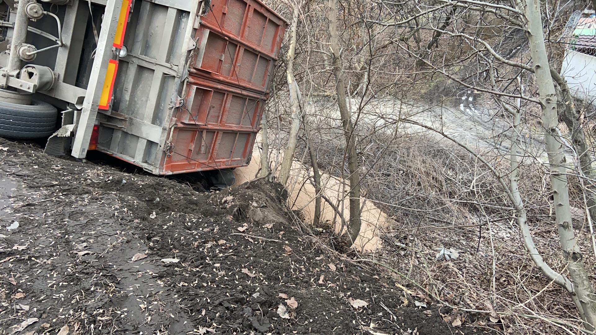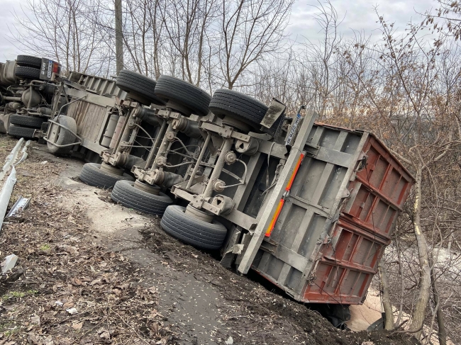 За словами водія, причиною цієї ДТП – стала яма на дорозі, в яку він випадково влетів. Чоловік був пристебнутий паском безпеки, отож ушкоджень не отримав. Вантажівка пошкодила лише відбійник, а на вулиці Князя Володимира миттю утворились затори. З кузова автомобіля, який впав на бік, посипалися висівки.