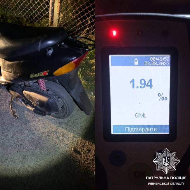 – Учора вночі, близько 1-ї години, патрульні на вулиці Севастопольській побачили скутер Suzuki Lets без номерного знака. Зупинили 22-річну водійку. Під час спілкування інспектори помітили у жінки ознаки алкогольного сп’яніння та запропонували пройти огляд. Результат — 1,94 проміле, – повідомили у прес-службі патрульної поліції Рівненщини.