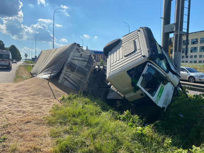 Очевидці кажуть, що вантажівка ДАФ з волинськими номерними знаками зненацька стала «петляти» на трасі, кілька разів наїхала на відбійник та пошкодила його. Після цього за інерцією в’їхала у металевий стовп і перекинулась на бік. Зерно, яке було у вантажівці, розсипалось на дорозі. Транспортний засіб отримав значні механічні пошкодження. Швидка допомога забрала травмованого 35-річного водія в обласну лікарню. У потерпілого політравма та забої. Обставини цієї ДТП поліція ще з’ясовує.