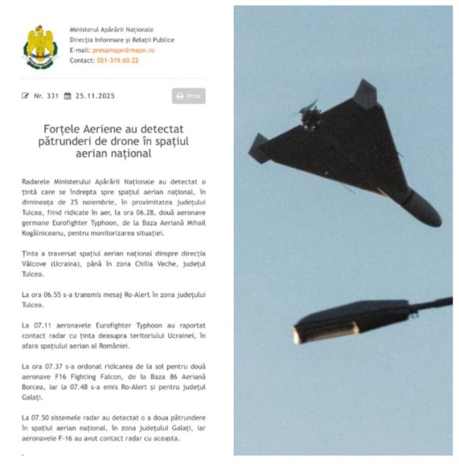 – Вранці два «шахеди» залетіли у повітряний простір Молдови та Румунії. Перетнули кордон приблизно о 07:44, згідно з повідомленням наших Повітряних Сил. В міноборони Румунії вранці повідомили, що військові радари виявили повітряну ціль, яка прямувала до повітряного простору країни, і о 06:28 за європейським часом з авіабази «Міхаїл Когелнічану» підняли два німецькі винищувачі Eurofighter Typhoon.