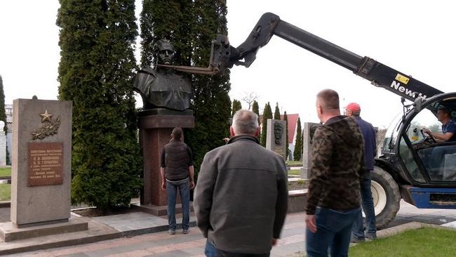 ♦ Стела Героїв Радянського Союзу на Театральній площі: демонтаж текстів, плит та символів тоталітарного режиму (зірка).