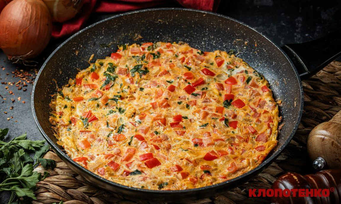 Поріжте кубиком цибулину, томат, солодкий перець і подрібніть гілочки зеленої цибулі. Окремо злегка збийте 5 яєць. Розігрійте на пательні олію і масло. Викладіть спочатку цибулю, обсмажте протягом 2–3 хвилин. Далі — перець, смажте ще 2–3 хвилини. Додайте томат, накрийте кришкою та тушкуйте протягом 5 хвилин. Посоліть овочі, додайте зелену цибулю. Далі додайте збиті яйця та перемішайте. Накрийте пательню кришкою та смажте протягом 5–7 хвилин.