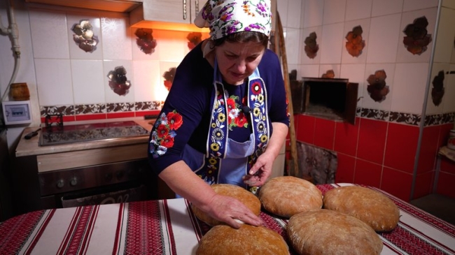 Опару пані Галина залишає на ніч для бродіння і зранку замішує тісто, використовуючи суміш житньо-пшеничного борошна та сіль. Майже годину триває цей процес. Аж поки тісто почне відставати від рук, як кажуть у селі “до чистої руки”. Тоді господиня залишає його, щоб підходило. І тим часом розпалює піч, якій 45 років.