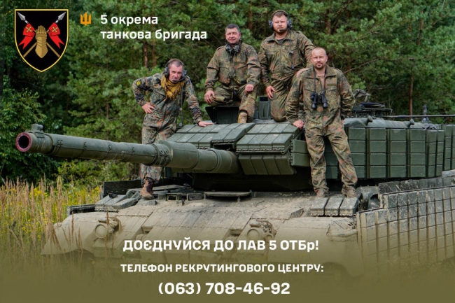 “Якщо ти прагнеш стояти на захисті нашої країни, готовий приймати виклики і знаєш, що твоє місце – серед відданих своїй справі бійців, тоді чекаємо на тебе в наших лавах! Ти не один, коли стоїш за свою країну! Обирай стати частиною військової сили, що пише історію кожного дня. Стань частиною захисту України! Приєднуйся до нашої бригади! Зв’яжись із нами за номером 063-708-46-92, щоб отримати більше інформації”, – закликає командування 5 ОТБр.