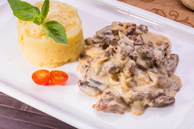 Додати до овочів обсмажене раніше м’ясо. Поверх м’яса викласти сметану і перемішати, посолити та поперчити. Влити 2 склянки гарячої води, ще раз перемішати, накрити кришкою й залишити тушкуватися на 30 хвилин. Далі — часник і спеції за смаком. Подаємо — з пюре, гречкою, рисом чи макаронами.