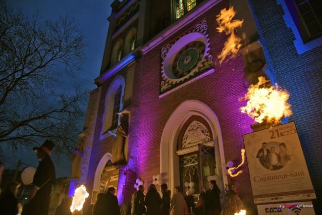 Їх зустрічали артисти філармонії в строях. Гості йшли по червоній доріжці, а шлях їм освітлювали справжні вогняні факели, що спалахували полум’ям біля входу.