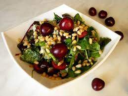 Черешню помити й обсушити, розрізати навпіл і видалити кісточки. У глибоку тарілку викласти подушку з руколи, зверху викласти волоські горіхи, половинки черешні і моцарелу, скропити оливковою олією і бальзамічним оцтом.
