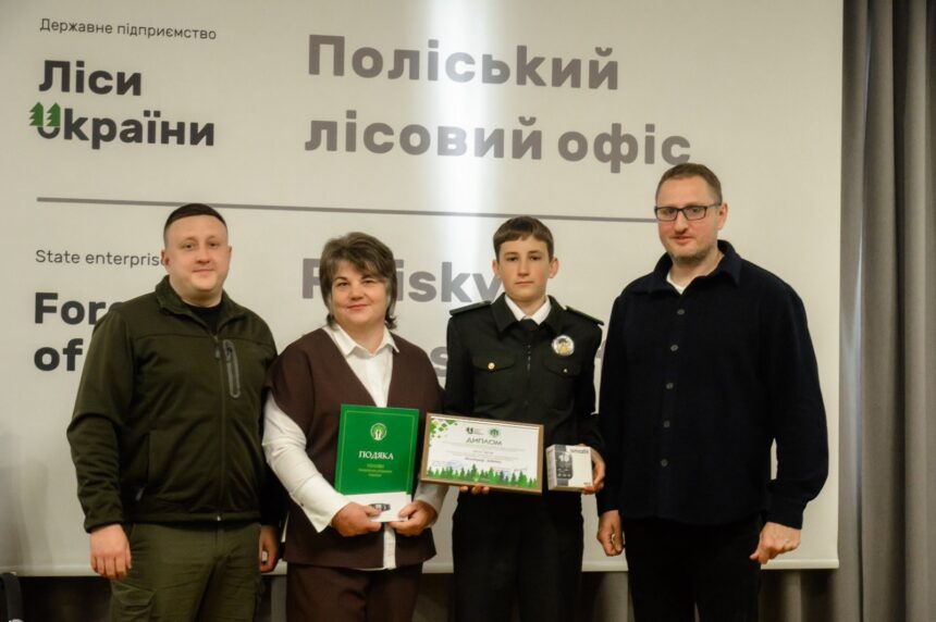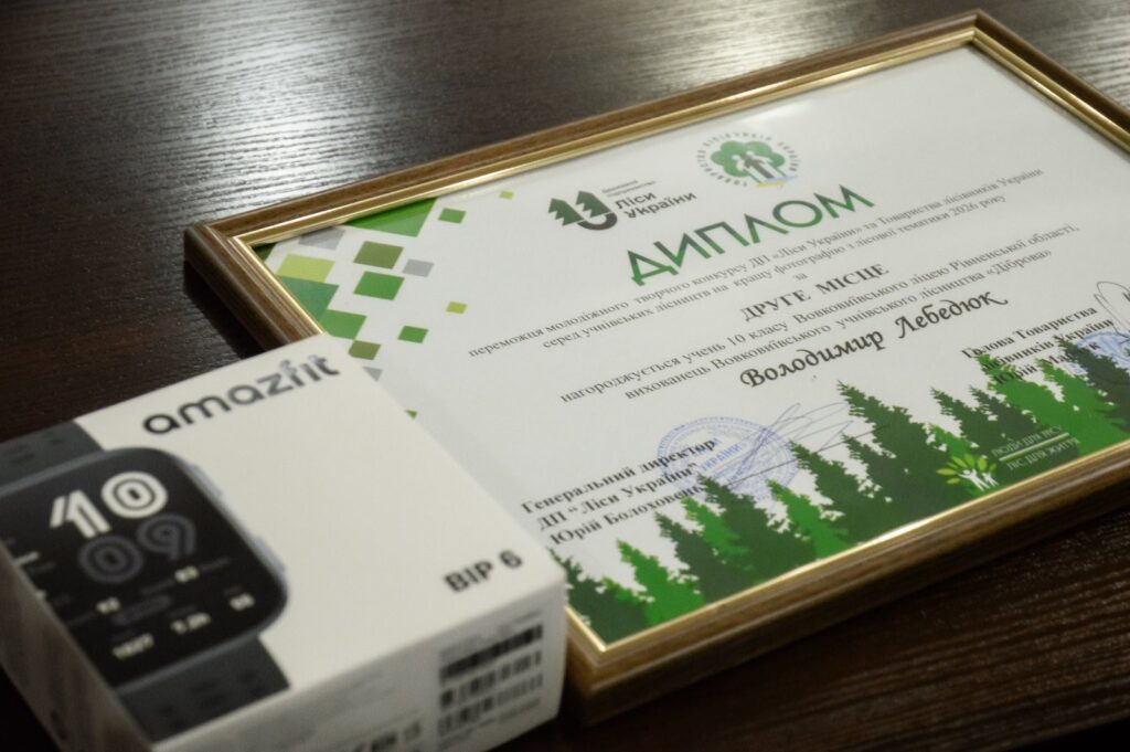Нагороду – смарт-годинник і диплом – юному лісівнику вручили директор Поліського лісового офісу Віталій Кошмак та голова Товариства лісівників Волинської та Рівненської областей Олександр Рибчинський.