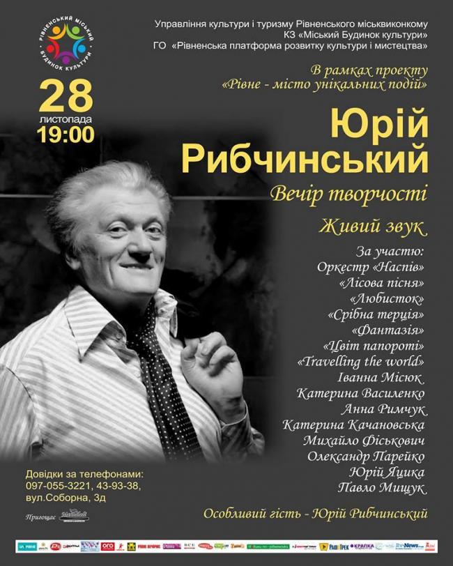 Його тексти неповорні. «Скрипка грає», «Дівчина-весна», «Біла ворона», «Вперше», «Духмяна ніч», «Знову у гори я йду»… Усі вони стали пісенними шлягерами багатьох поколінь. Юрій Рибчинський співпрацював з такими видатними особостостями як Володимир Івасюк та Микола Мозговий, які вже ставали героями наших арт-проектів. Він писав пісні для Софії Ротару, Наталії Могилевської, Руслани Лижичко та багатьох інших відомих артистів. Але, повірте, на сцені Будинку культури його твори зазвучать по-новому у виконанні найкращих артистів Рівного. Колективи та солісти МБК, серед яких оркестр «Наспів», тріо «Срібна терція» та «Любисток», гурт «Лісова пісня», «Travelling the world», Іванна Місюк та інші. Запрошені музичні гості: Анна Римчук, Михайло Фіськович, Олександр Парейко, Катерина Качановська — це не весь перелік тих, хто готується вас вражати. Власні інтерпретації, майстерність виконання, мелодійні дуети, цікаві постановки! А ще ми плануємо здивувати вас не лише музично, а й технічно!