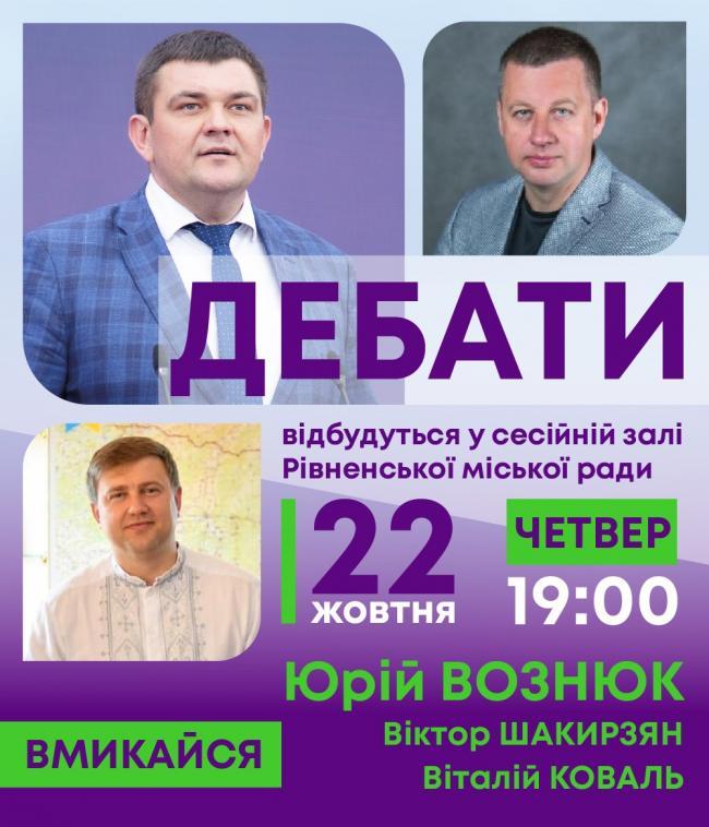 У четвер, 22 жовтня, о 19:00. Вважаю, що рівнянам буде цікаво. Трансляцію зробимо на youtube-каналі, відтак показати ці дебати зможуть усі ЗМІ, – додав Юрій Вознюк.
