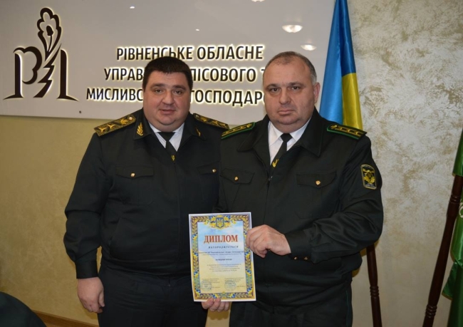 Колишній керівник обласного управління лісового та мисливського господарства Віталій Сухович нагороджує керівника Костопільського лісгоспу Олександра Мелещука