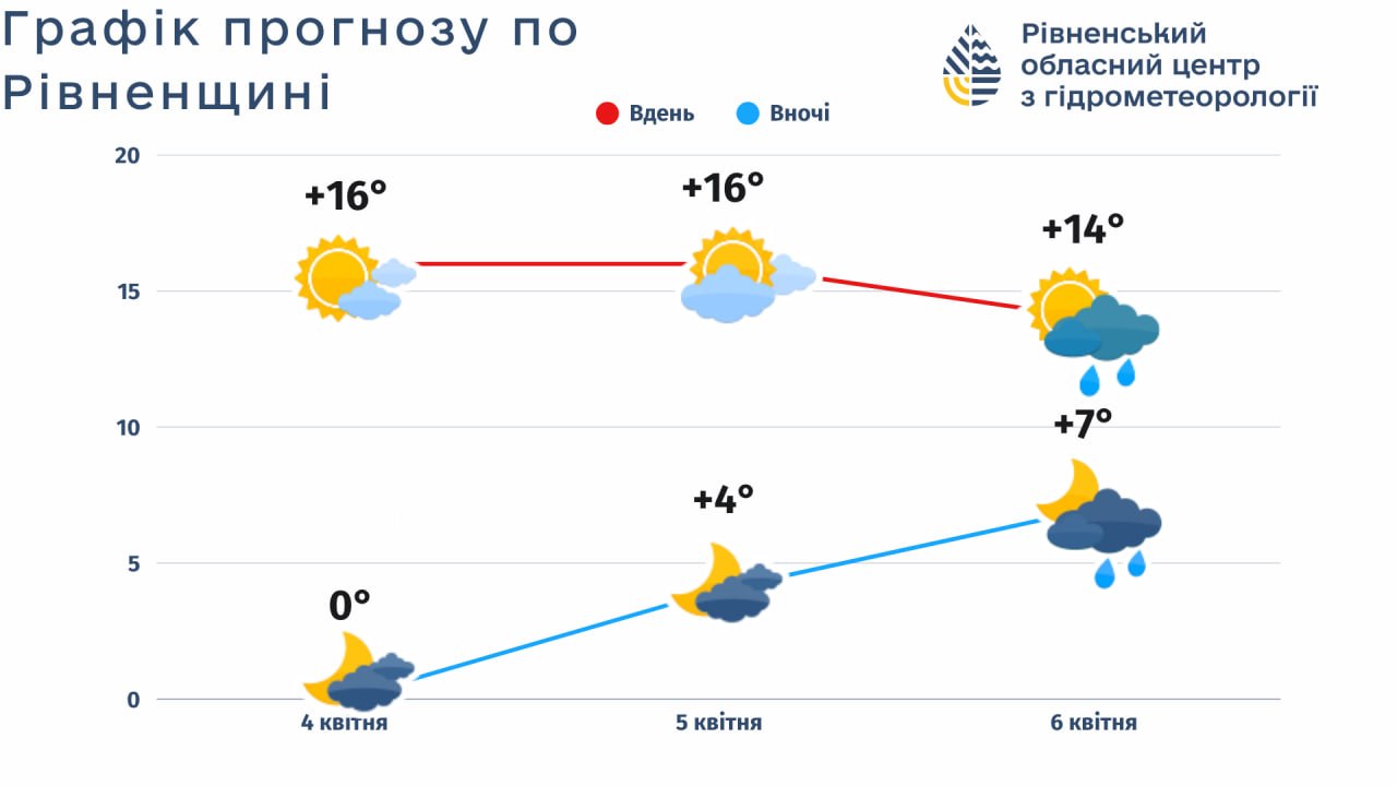 4 квітня, субота: мінлива хмарність. Без опадів. Вітер західний, 7-12 м/с. Температура вночі -2,+3°, вдень 12-17° тепла. Атмосферний тиск буде слабо рости.