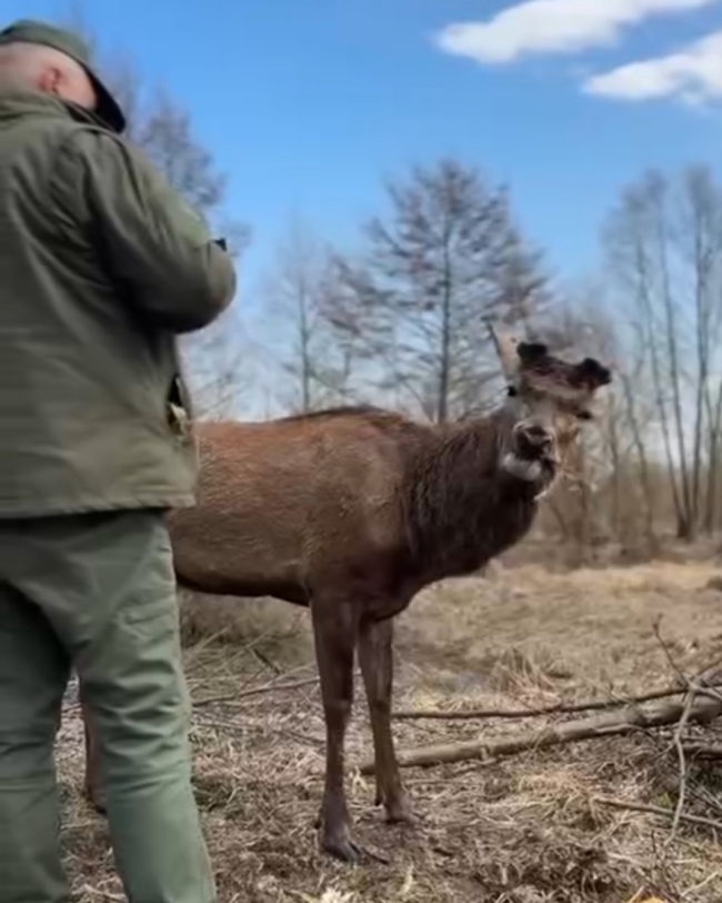 – Нагадаємо: 6 років тому Руслан Христюк із колегами вирішили заселити в місцевих угіддях оленів. Збудували вольєр, закупили тварин. Згодом усіх випустили в дику природу. А лідер стада – олень Борис – став жити на два фронти: в лісі з тваринами, і в Зарічному з людьми. І всюди справляється. Він водить стадо не менше з 50 оленів, роздає інтерв’ю та приймає гостинці. Люди несуть йому яблука, банани, овочі, але Борис – не такий простий. Якось лісівник купив йому найгарніші магазинні яблука, а олень понюхав і відвернувся. Нітрати не для нього. Борис дуже серйозний. Дітям дозволяє себе гладити та обіймати, але дорослих перевіряє: якщо відчуває фальш або негатив, може навіть дати відсіч. Одного разу його образили – і олень просто пішов у ліс. Зник, не виходив на зв’язок. Навіть у TikTok, де, до речі, має майже 40 тисяч фоловерів! @olen.borys.4.5.0. – додають у Поліському лісовому офісі.