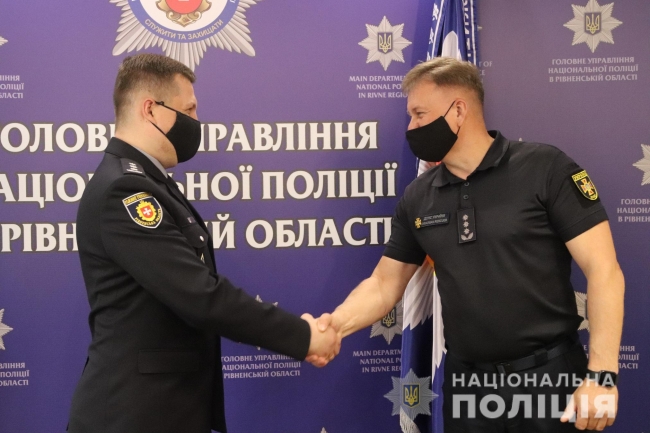 Керівник поліції області особисто вручив подяки співробітникам ГУ ДСНС в Рівненській області: рядовому служби цивільного захисту Івану Дем’янчуку, сержанту служби цивільного захисту Олександру Середі, прапорщику служби цивільного захисту Олександра Гончара.