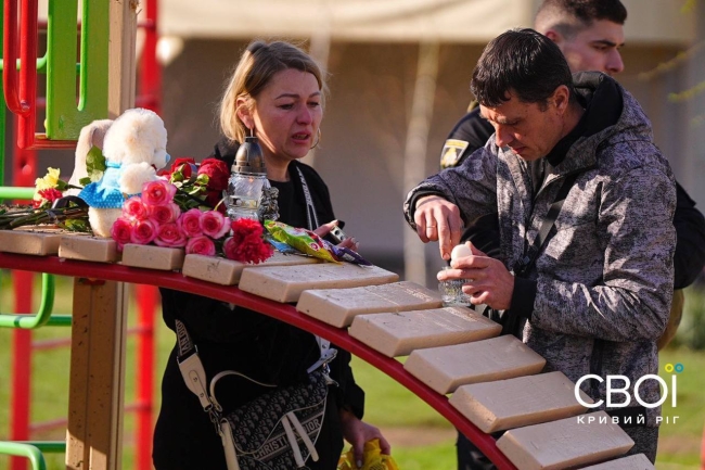 7, 8 та 9 квітня в Кривому Розі оголошені Днями жалоби. Люди несуть до дитячого майданчика квіти з чорними стрічками та іграшки…