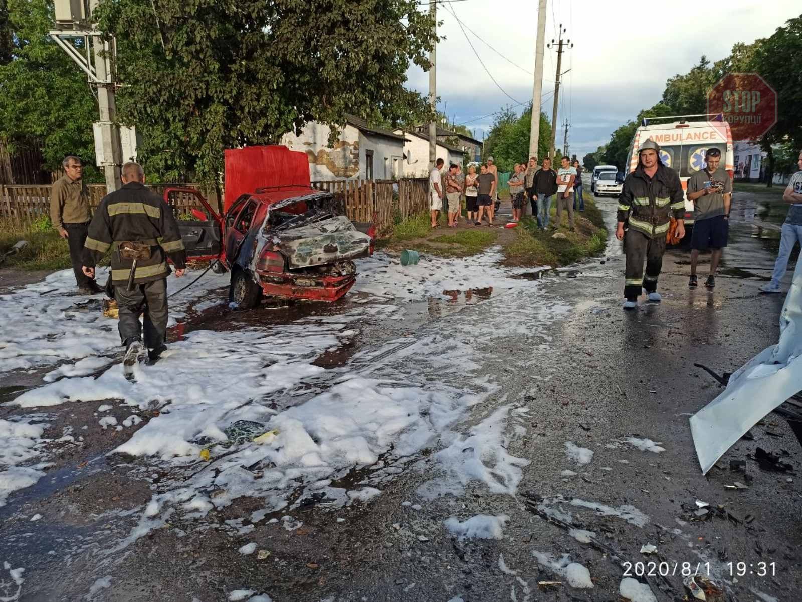 Водій авто встиг покинути авто, хоч і отримав опіки, проте на передньому сидінні залишилася пристебнутою жінка, яка не могла вибратися через заблоковані двері.