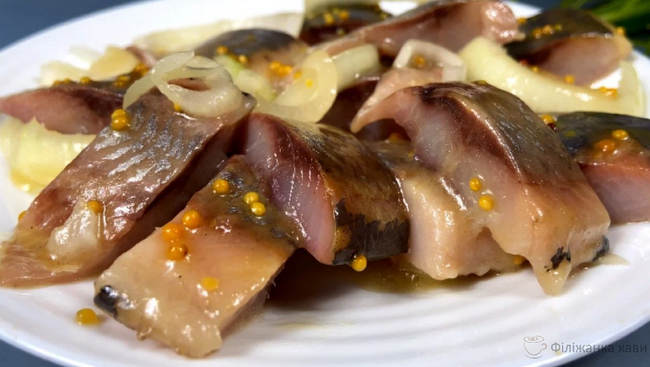 Для приготування потрібні такі продукти: ріпчаста цибуля — 2 шт., сіль — 1/2 ч. л., цукор — 1/2 ч. л., оцет 9% — 2 ст. л., оселедець малосольний — 2 шт., гірчиця гостра — 2 ч. л., гірчиця зернова французька — 2 ч. л., мед — 1 ст. л., лимонний сік — 2 ст. л., олія — 100 мл.