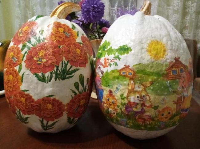 Валентина Нагорна з Дубенщини показала у Фейсбуці свої роботи на гарбузах.