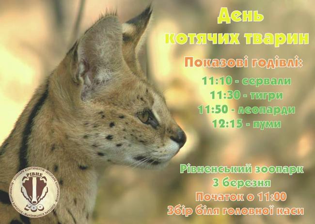 Захід розпочнеться об 11-й годині. Вже оприлюднили графік показових годівель пум, тигрів, сервалів та леопардів.Відвідувачам розкажуть цікаві факти про котів, покажуть, як їх годують та як за ними доглядають.