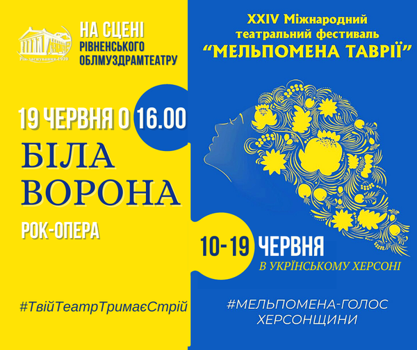 – Новини Херсону останнім часом сумні-сумні… Але ми звикли шукати в усьому промінь сонця, як і херсонці. Саме тому у червні ми долучаємось до щорічного херсонського фестивалю “МЕЛЬПОМЕНА ТАВРІЇ 2022”. З очевидних причин, 24-ий за ліком фест пройде поза Херсонський театр імені Миколи Куліша але у 25 містах 7 країн світу!!! Театри-учасники показуватимуть вистави на своїх рідних сценах під егідою та в загальній афіші фестивалю. На нашій сцені 19 червня о 16.00 у рамках Мельпомена Таврії відбудеться показ рок-опери “Біла ворона”, – повідомив колектив Рівненського облмуздрамтеатру на сторінці закладу у фейсбуці.