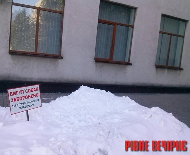 Біля входу до комунальної їдальні облради на майдані Просвіти у снігу стоїть табличка: «Вигул собак заборонено! Територія оброблена гербіцидами».