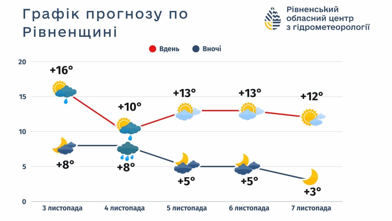 5 листопада, середа: хмарно з проясненнями. Без опадів. Вночі та вранці місцями туман. Вітер північно-західний, 5-10 м/с. Температура вночі 1-6º тепла, вдень 9-14° тепла.